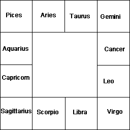 There are different forms of Chart. Here we are giving fixed sign Chart duly marking the sign name within the box and a list of symbols commonly used by astrologers for different Zodiac signs. Symbols of the planets are also given.